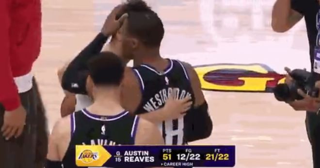 生涯之夜!里夫斯51+11+9+22罚21中刷爆纪录 赛后与威少拥抱